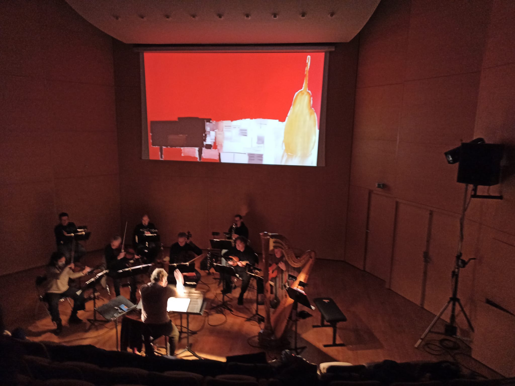 « D’une Sérénade l’autre » embarque le public dans un nouveau « voyage de l’écoute et du regard » où les images de Christophe Schaeffer émancipent le champ de perception offert à l’auditeur. En lien avec le projet de Laurent Cuniot, le vidéaste a travaillé à partir du tableau inachevé de Nicolas de Staël Le concert. La toile est peinte en 1955, quelques jours avant le suicide de l’artiste. Ce dernier y fixe ses impressions après l’écoute d’œuvres de Schönberg et Webern lors d’un concert du Domaine musical… Entre figures et abstraction, flux de matière et énergie de la couleur (le rouge du plasticien embrase l’écran au début du voyage), le vidéaste créé un espace qui interpénètre finement celui de la musique sans en concurrencer le mouvement : ainsi « l’œil écoute » en parfaite harmonie.