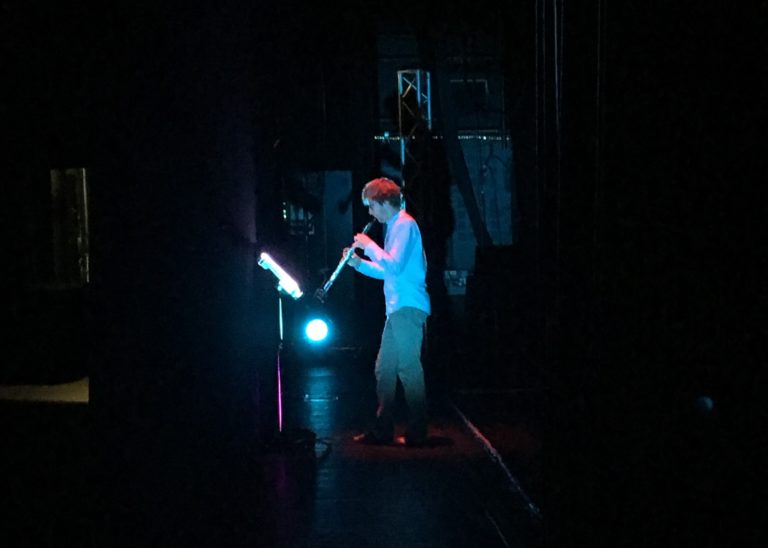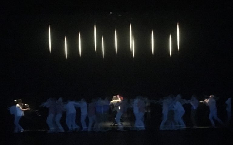 La soirée bascule dans une after party synesthésique avec Tablado, du compositeur franco-brésilien Januibe Tejera. Les lumières et vidéo-projections de Claudio Cavallari font apparaître et disparaître les neuf instrumentistes de TM+, fragmentent ou démultiplient les corps de ces fantômes noceurs d’un bal finissant.