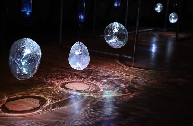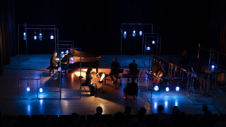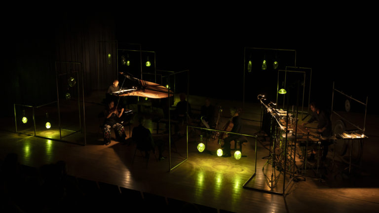 Sur la scène, l’œil écoute une sculpture mobile et sonore, l’oreille regarde les sculptures de verre suspendues et les scintillements des instruments.