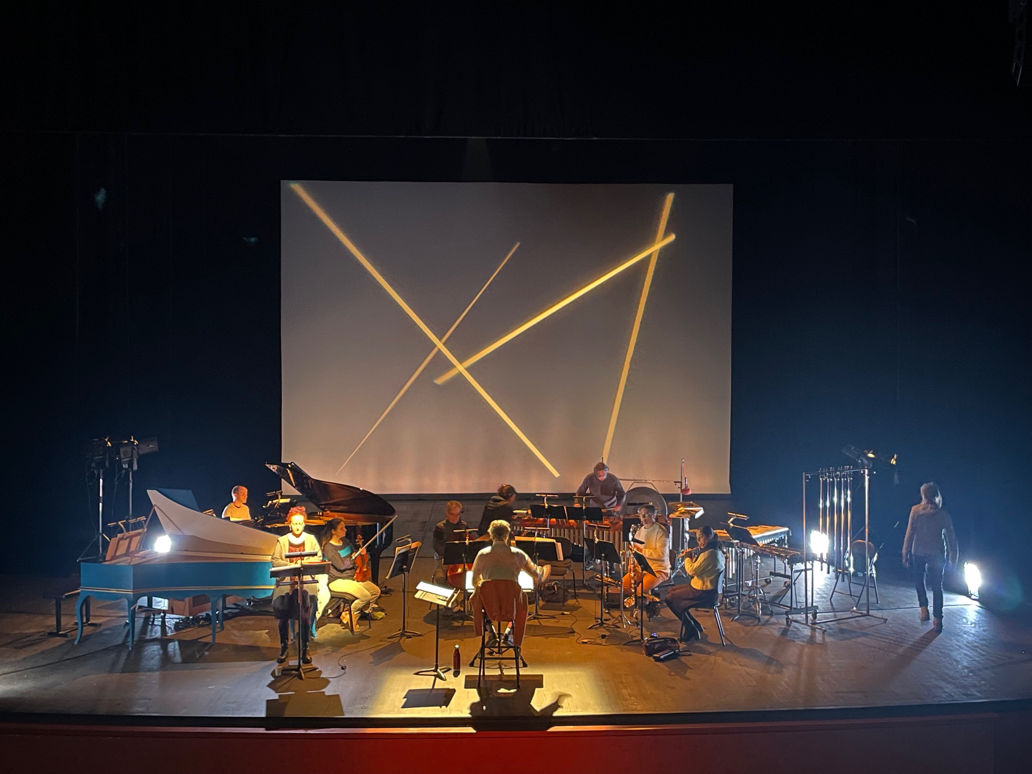 À la tête de son Ensemble TM+, le compositeur et chef d’orchestre Laurent Cuniot explore les époques et les styles, brouillant les frontières et tissant des correspondances inattendues. Ce soir, à l’Opéra de Massy, il mêle musiques des XVIe, XVIIe et XXe siècles. Le fil conducteur de ce programme en est l’invitation à la poésie nocturne. Les lumières de Christophe Schaeffer participent ainsi aux sonorités délicates et intimistes du clavecin tempéré mêlées à celles énigmatiques des percussions et du célesta. Violon, alto, flûte, clarinette et violoncelle apportent chacun son timbre avec néanmoins une homogénéité d’ensemble. Dans les œuvres d’ensemble, ils se laissent guider par la direction précise et souple de Laurent Cuniot. Dans les œuvres faisant appel à moins d’instruments, ils parviennent à s’auto-diriger et à assurer leur profonde attention aux phrasés. Le souffle musical et la continuité du programme reposent en grande partie sur Yannick Varlet et son clavecin. Par ses transitions habilement improvisées, il permet cette cohésion avec pour œuvre centrale la Passacaglia ungherese de Ligeti. Avec ce qui pourrait passer pour de la malice mais qui est en réalité une véritable proposition de couleurs, en jouant des tensions de son clavier tempéré, certains accords, loin de sonner faux, intriguent l’oreille par leur teinte singulière.