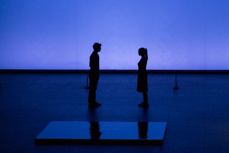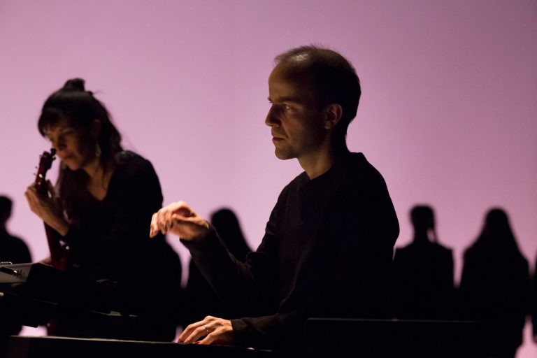 De part et d’autre, encadrant la scène avec guitare électrique, claviers et batterie, trois musiciens de TM+ délivrent riffs et clusters imaginés par Alexandros Markeas. Le compositeur a puisé l’inspiration dans la musique des années 1960 pour imaginer une partition d’aujourd’hui dans laquelle les mots et les notes se rencontrent au confluent d’une même histoire, faisant alterner, au fil tranchant et passionné des deux solistes, l’énergie pop-rock et le temps suspendu de la méditation.