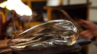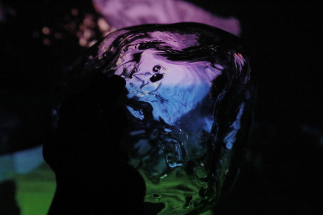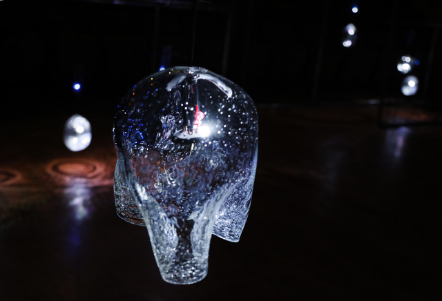 Sur la scène, l’œil écoute une sculpture mobile et sonore, l’oreille regarde les sculptures de verre suspendues et les scintillements des instruments.