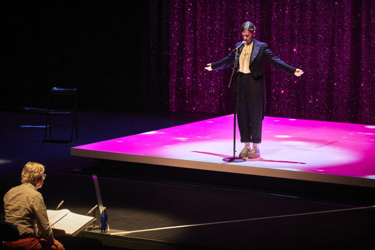 Don du ciel ou malédiction intime ? Son parcours ressemble à une descente au fond de soi, de la gloire factice du cabaret à la solitude intérieure d’un homme qui a perdu le sens de sa vie par le trop-plein. L’écriture d’Alexandros Markeas fait tourner sur eux-mêmes les connexions frénétiques de la mémoire, les décors des univers successifs, la douloureuse accumulation des souvenirs vidés de leur substance, elle fait sonner la quête impossible du sens.