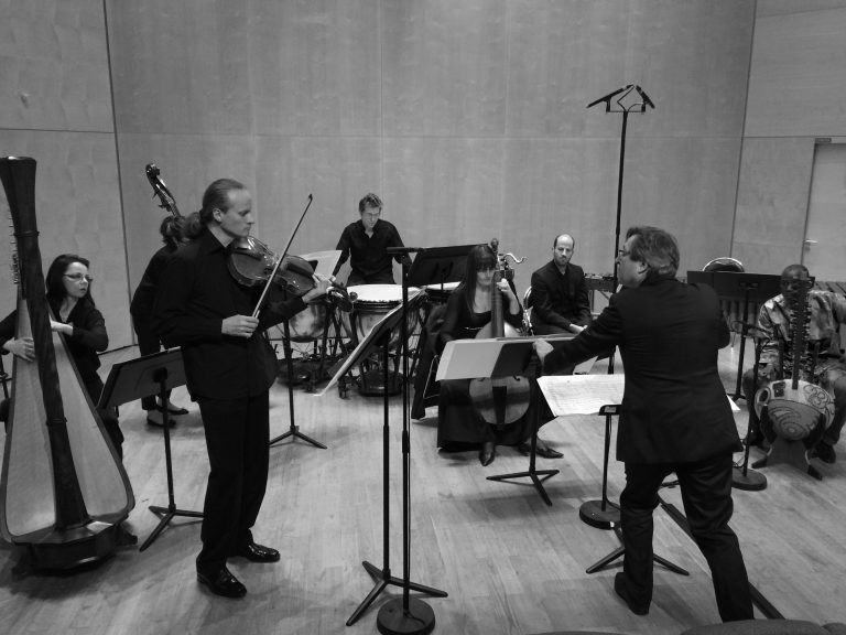 La formule originale met en correspondance musicale des œuvres de Bernard Cavanna, pour harpe et petit effectif, interprétées par les musiciens de TM+, et l’univers de Ballaké Sissoko déployé à la kora, cette harpe d’Afrique de l’Ouest à trois fois sept cordes dont on dit qu’elles symbolisent la flèche du temps. Derrière les notes des Cinq pièces pour harpe de Cavanna